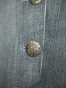 Aus gebrauchten Jeanshosen genähtes Kleidchen. Ein schönes Geschenk in traditionellem Look. Mit gemusterten Belegen aus Folklorestoff. Vorne durchgeknöpft mit wunderschönen Trachtenknöpfen aus Metall. Durch den Stoff von gebrauchten Jeans kann es farbliche Abweichungen geben. Deshalb ist jedes Kleid ein Unikat.