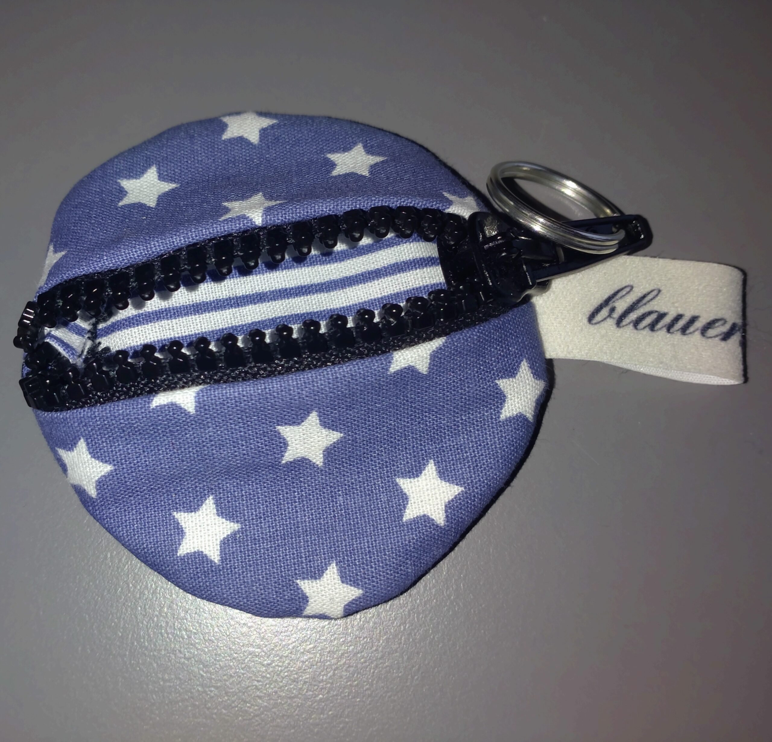 Aus Baumwollstoff. Kann als Schlüsselanhänger benützt werden. Für Münzen oder andere Kleinigkeiten.